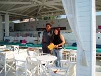 A tulajokról? Méri, a művésznő kinézetű, Nikosz a hippi kinézetű, végtelen precíz, pontos és nagyon házias pár. A legjobb barátaimmá váltak nekem is az idők folyamán. A vendégek különösen Nikoszhoz ragaszkodtak. Ő jól beszél angolul is, nagyon megszerette a magyar temperamentumot. Ezen a szálláson főleg nagyobb baráti társaságok voltak. Nikosz nélkül nem indult meg az esti parti. Ha valaki horgász-szenvedéllyel bírt, megint Nikosz kellett hozzá. A 10. szomszédból küldtem hozzá a segítségre szoruló vendégeimet, Nikos félretette a felmosót, vagy a fűnyírót és ment autószerelőt keresni. Méri intézte a biztosítókkal a kártérítéseket. Nem tudom felsorolni, hogy mi mindennel fordultunk nap mint nap hozzájuk, sokszor még hajnalban is.
